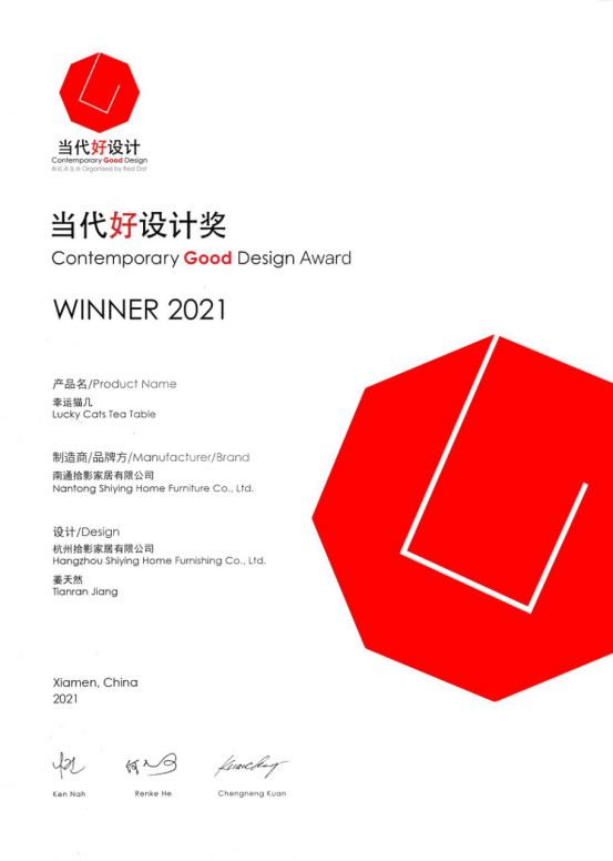 其中,有一款来非常特别的边几一路过关斩将,摘得当代好设计奖,赢得了众多专业评审的高票称赞,它就是来自杭州拾影家居有限公司旗下品牌——朴愫木作的“幸运猫几”。