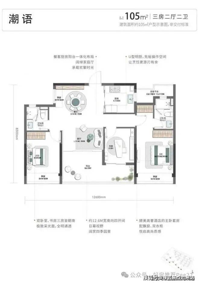 首先,项目的户型起步就是四开间朝南的建面约105方三房: