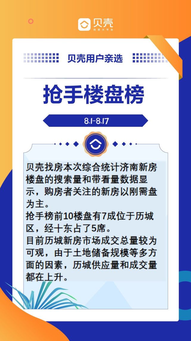 8月上旬济南市抢手楼盘有哪些,你知道吗?来看根据贝壳济南站来看看!