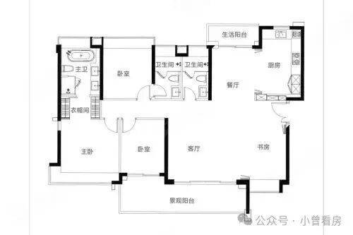 124㎡四房作为PLUS版本,在121㎡的基础上增加了餐厅北侧的生活阳台,景观阳台也延伸至书房,储物与观景功能更完善 。
