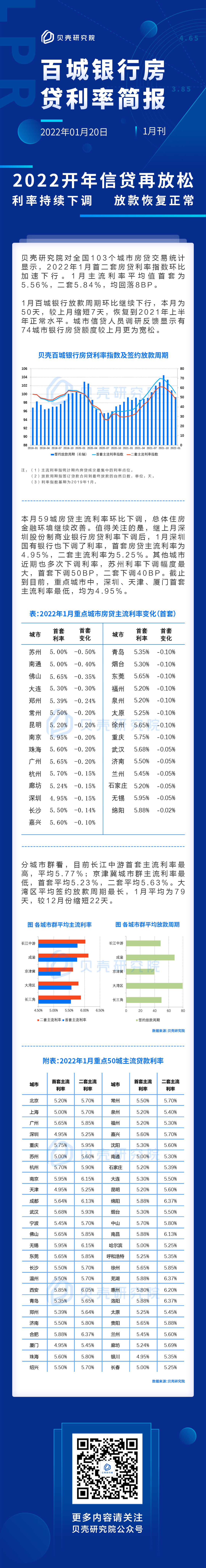 2022年1月20日,中国人民银行授权全国银行间同业拆借中心公布:1年期LPR为3.7%,自去年12月回调5个基点后再次下调10个基点;5年期以上LPR为4.6%,较上月回调5个基点,为连续20个月不变后首次下降。贝壳研究院发布重点城市主流房贷利率数据:2022年1月贝壳研究院监测的103个重点城市主流首套房贷利率为5.56%,二套利率为5.84%,均较上月回落8个基点;本月平均放款周期为50天,较上月缩短7天。
