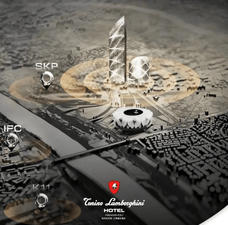 瑰郦中心引入了杭州第二家兰博基尼Veneno酒店。Veneno作为一款全球仅限13辆的兰博基尼顶级跑车,以它命名的酒店,自然比兰博基尼Rosso酒店定位更高端,配套更华丽。
