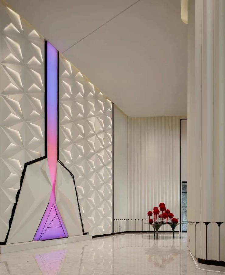步入挑高约11米的一楼大堂,折线通高墙面与钻石切割前台 ,像极了兰博基尼发动机的散热鳍,又似来到澳门七星级酒店摩珀斯。