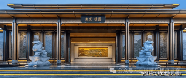 联通会所负一楼的车马院,波浪屋顶暗合姑苏临水而居的文化,搭配进口米色石材墙面,构成迎宾的殿堂。