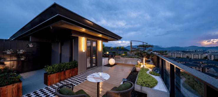 屋檐是屋顶距离人的视线最近的部位,檐口是屋檐的末端。为保留飞檐的灵动,澜院严谨推敲屋面弧度,屋面檐口采用平檐的檐口做法,工艺材质则使用铝代木,在“不可增一分,不可短一毫”的苛刻技法下,描摹中式建筑的柔美曼妙,整个屋顶也更加奢华耐久、现代精致。