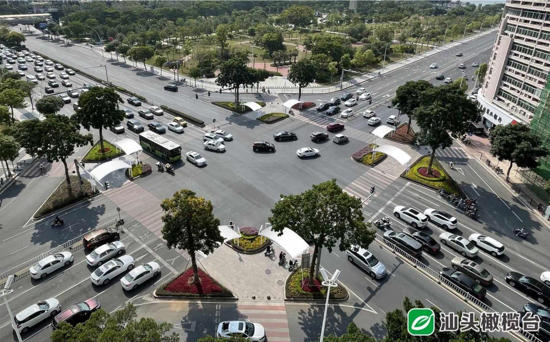 【幸福感爆棚~过马路有“大白伞”为你遮阳挡雨】为方便行人和骑行者在路口渠化岛等待交通信号灯,近日,市城管部门从“为群众办实事”的角度出发,在市区中山金环路口试点建设一批便民遮阳挡雨设施,形成一道独特景观,受到市民点赞。