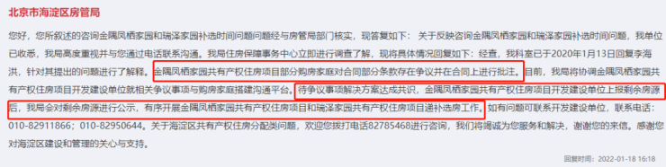 建委两个月前给出的答复是待争议事项解决方案达成共识,金隅凤栖家园上报剩余房源后,将会对剩余房源进行公示,之后有序开展金隅凤栖家园和瑞泽家园递补选房工作。