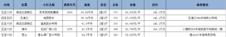 血拼哥给大家筛选了一下海淀总价300万~400万之间的两居公房,首付基本上在150万上下。位置大多还不错,不少邻近地铁,通勤非常方便!