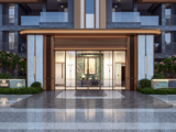 项目采用12米高拱券大门、宝格丽绿石材与古铜金属线条交织,形成迎宾序列;意大利贝金米黄石材弧形景墙与铜马雕塑传递“龙马精神”寓意。近十二米通高的拱券,通体以石材打造,层层叠涩,气势恢宏。