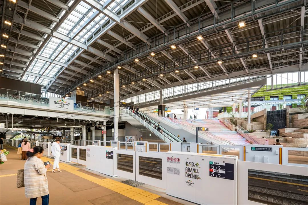 日本南町田Grandberry Park占地面积达22公顷,以田园商业综合体为定位,所在地涵盖东急田园都市线南町田车站、商业园区、及毗邻的鹤间公园。为加强区域活力,项目依托便捷的交通干线,利用场地现有的自然高差,将车站、商业空间、公园三个区块通过大型阶梯、绿色屋顶和景观连接起来,形成三个主题鲜明独特的子区域。整体穿插七个开放式广场,辅助打造游逛性公园商业体。