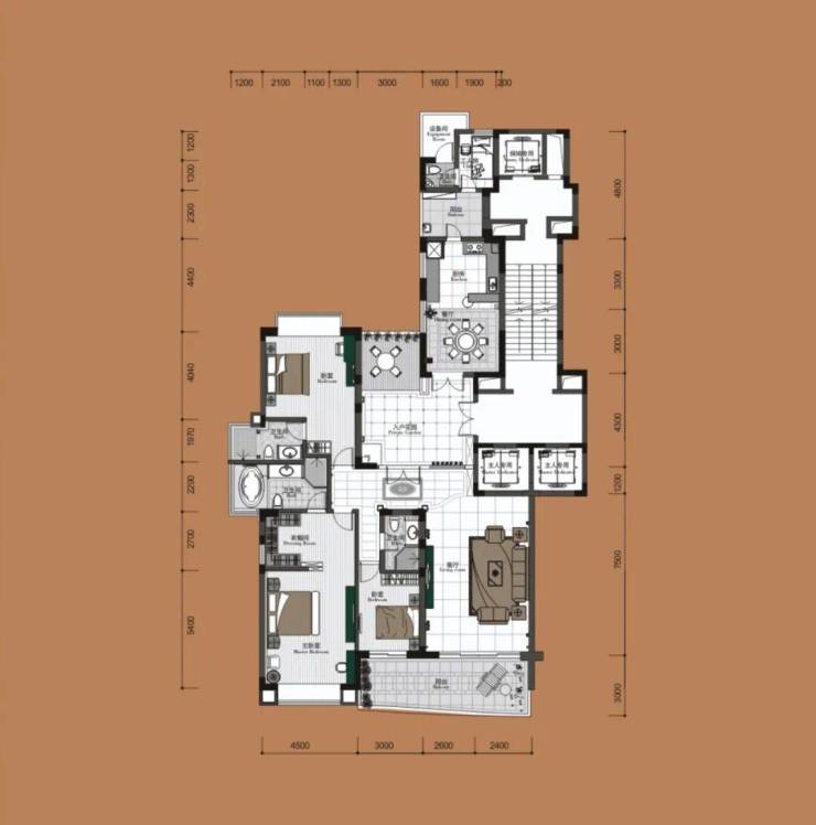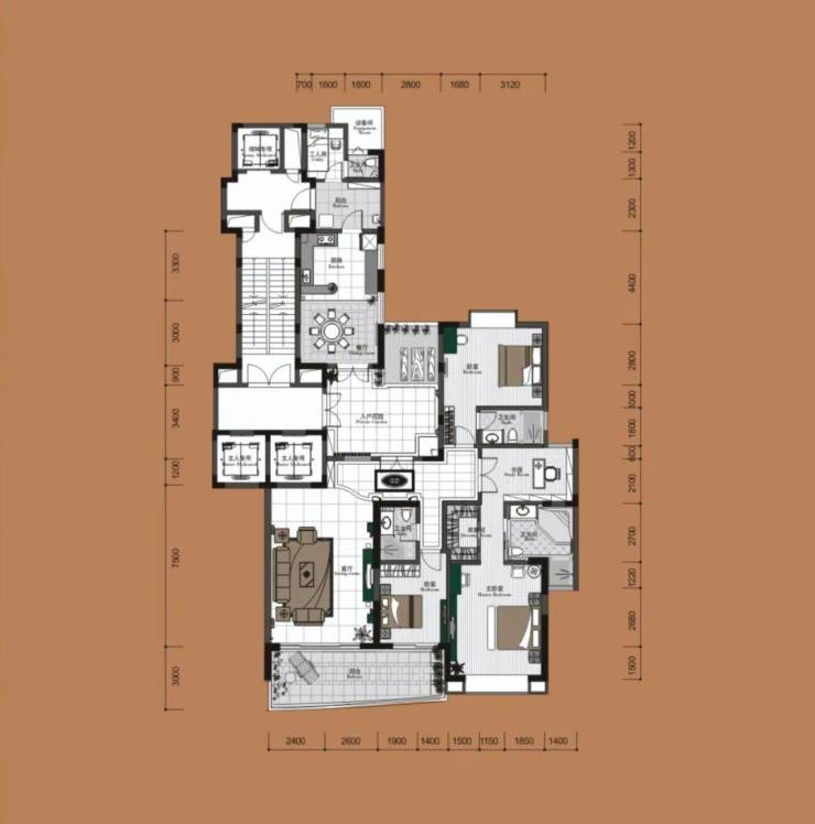 A户型:建面约252㎡、三房两厅四卫+工人房+超大入户花园(豪装)