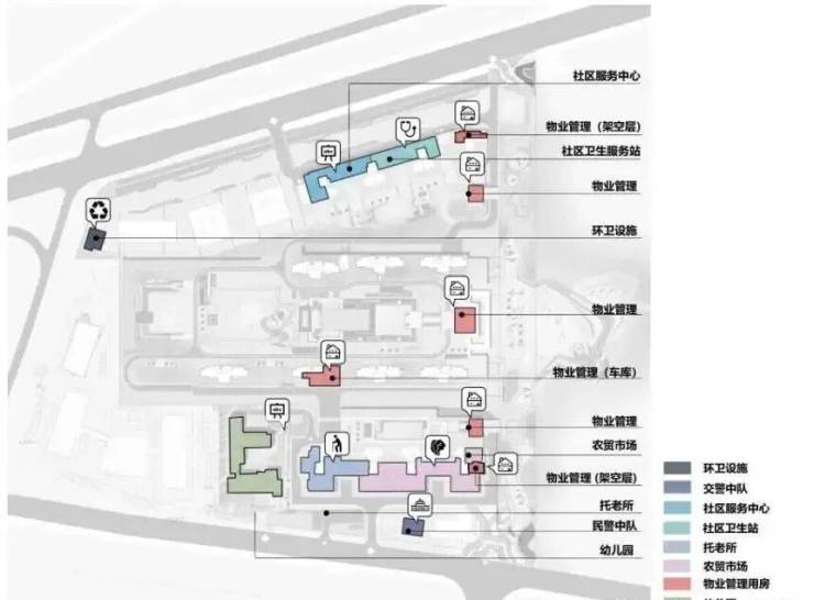 南地块设置有18班幼儿园,约2000平方米的现代生活市场,约1000方的老年生活中心,民警中队以及配套商业;在北地块设置有社区服务中心,社区卫生站及配套商业;地块南侧设有规划小学,东南侧设有独立商业,使得地块生活便利,教育资源丰富,为办公生活提供了美好便利的生活环境。