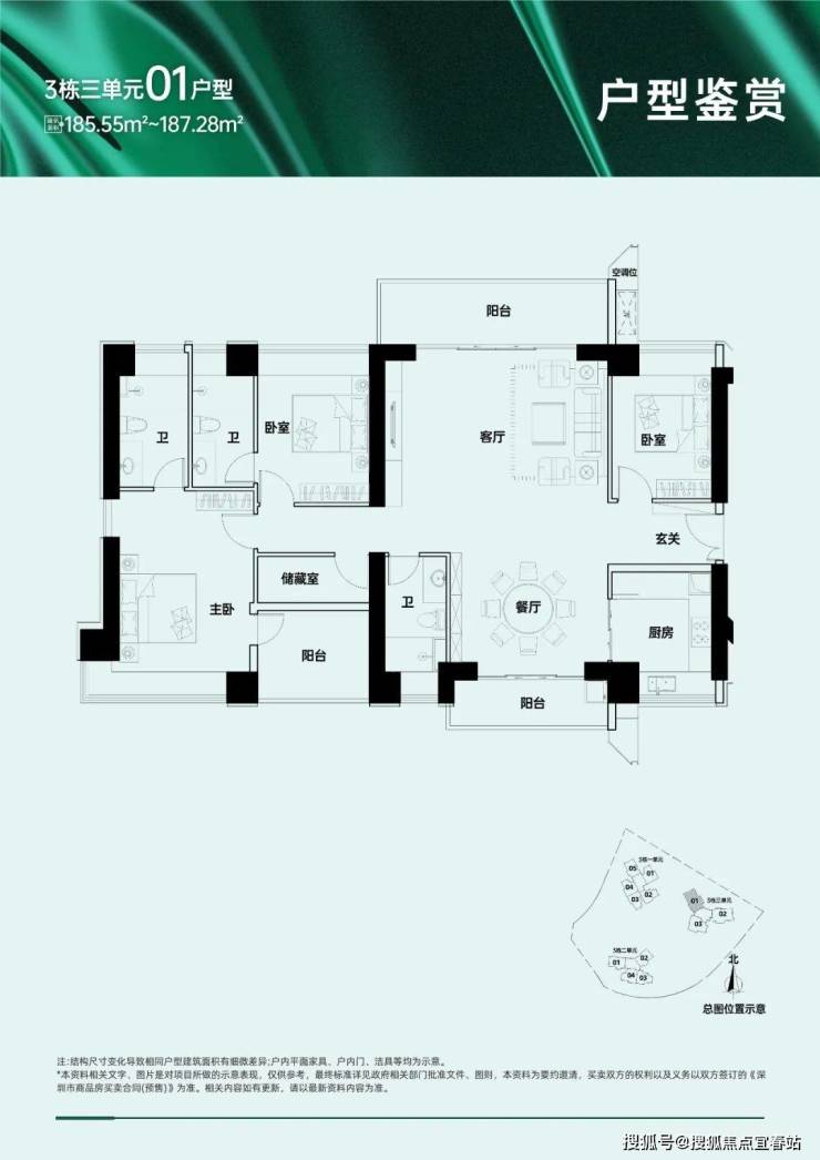 186㎡的4房2厅3卫,仅3栋3单元01.02户型,设计的是竖厅格局,南北通透双阳台,全屋飘窗,五开间朝南,U型厨房,卫生间干湿分离,得房率:71.78%(不含赠送),阳台主朝东北向。