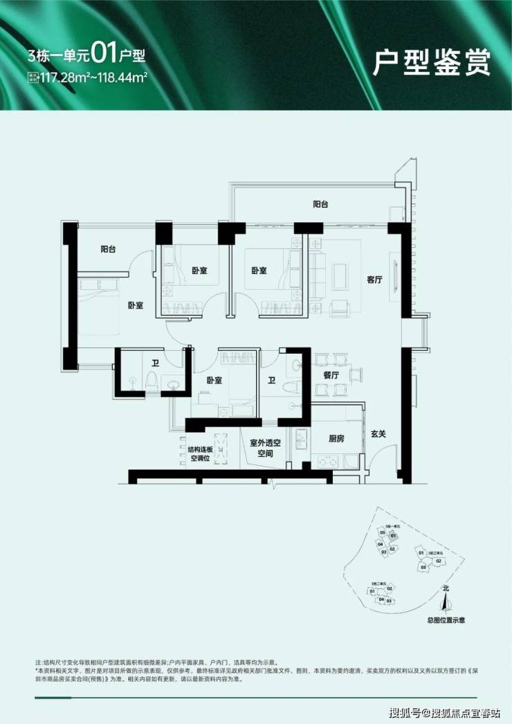 118㎡的4房2厅2卫,仅3栋1单元01户型,设计的是竖厅格局,LDKB一体化设计,客厅连接次卧出超大阳台,U型厨房,卫生间干湿分离,得房率:75.57%(不含赠送),东北朝向。
