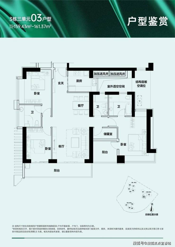 159㎡的4房2厅3卫,仅3栋3单元03户型,设计的是竖厅双龙抱珠格局,LDKB一体化设计,四开间朝南,客厅连接次卧出超大阳台,U型厨房,卫生间干湿分离,得房率:71.77%(不含赠送),西南朝向。