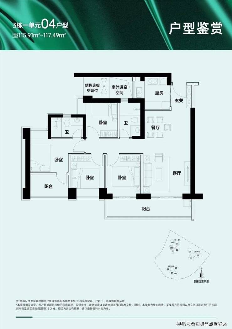 118㎡的4房2厅2卫,仅3栋1单元05户型,设计的是竖厅南北通透格局,全屋飘窗,四开间朝南,U型厨房,卫生间干湿分离,得房率:75.57%(不含赠送),阳台主朝西南向。