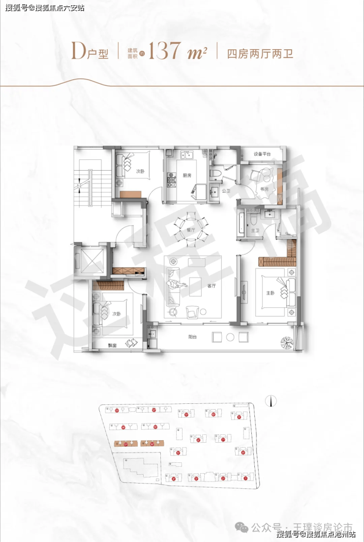 137㎡四房两卫:12米面宽客厅连接转角飘窗,主卧配置270°观景飘窗+独立衣帽间
