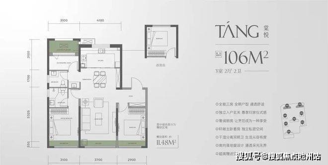 ②户型反套路:106㎡三居竟有6.8米跑道阳台,北向次卧改书房送飘窗,比周边竞品多偷3㎡实用面积;