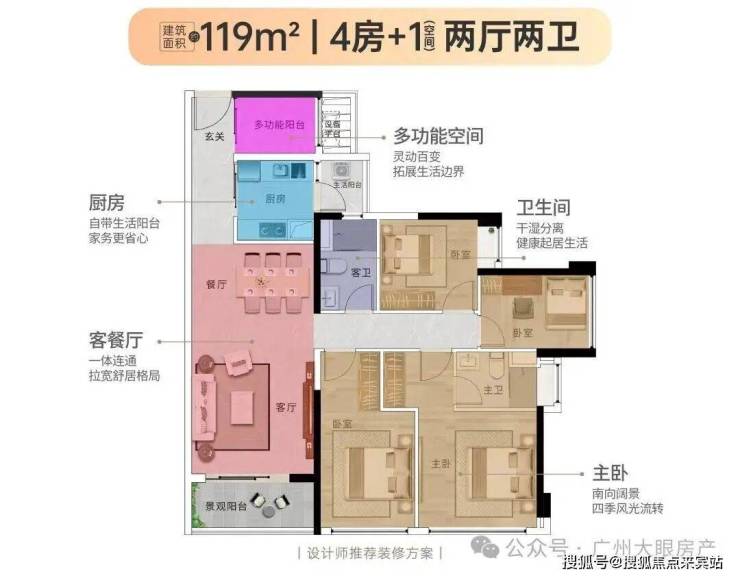 【119㎡4+1房2厅2卫】南向通风三开间采光,经典竖厅,南向奢阔主套,配步入式衣帽间,改善户型首选,低总价换房天河