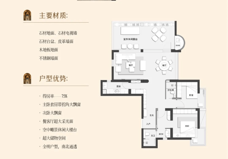 118㎡2房2厅2卫+25㎡室外休闲露台 东北 850万