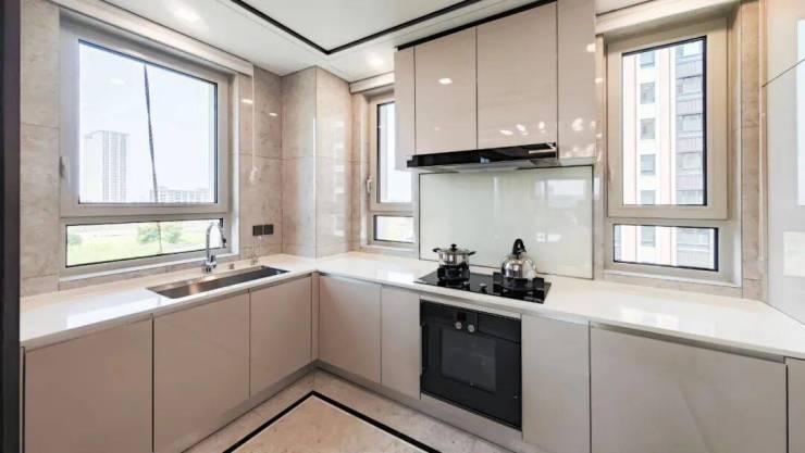 卫生间使用的都是德系领衔的知名品牌,比如汉斯格雅,杜拉维特等。厨房用的品牌也相当高级,除了博世的灶具和洗碗机,还配备了电器中的爱马仕,嘉格纳的内嵌式冰箱,全线对标顶流豪宅。