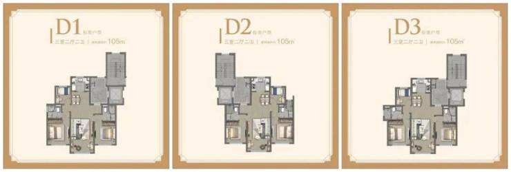 建面约105㎡3房,3个户型都做到了“双南套房”, 三开间朝南+飞机户型+LDKG一体化,空间感十足。
