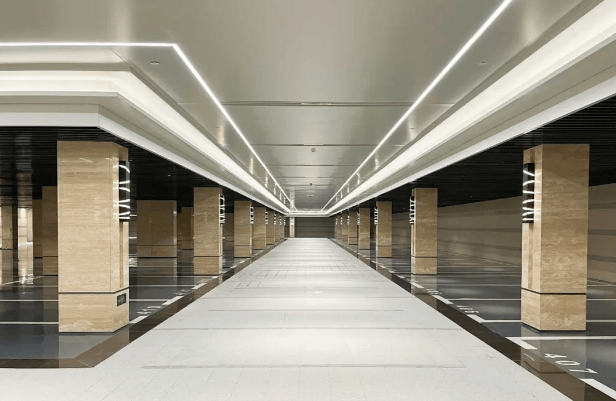 车位部分采用镜面环氧树脂,吊顶采用铝板,立柱还采用石材做包裹装饰,空间宽敞且明亮通透。