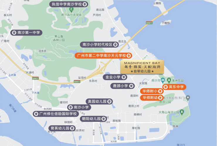南沙小学时代校区(公立):南沙第一家省一级小学,直线距离2km,南沙老牌好学校,雄厚的师资力量,现代人性化的管理模式。