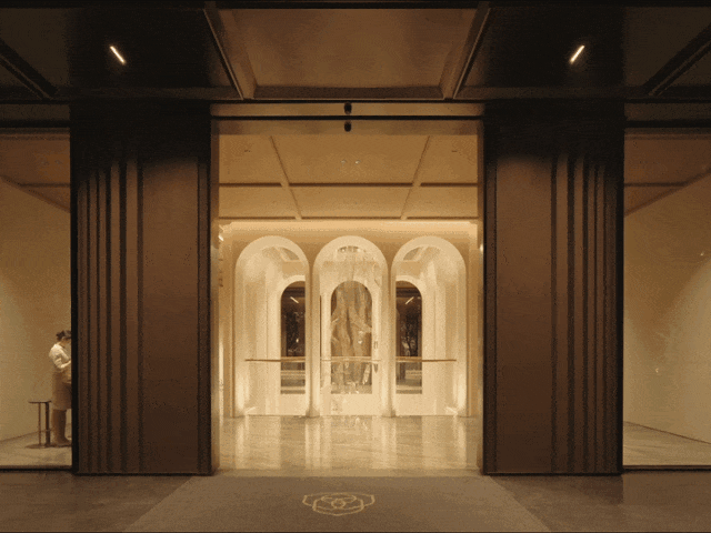 垂直通高的花厅空间将地上与地下空间联系再一起,洞石白圆拱成为光线过滤器,阳光穿透时在墙面生成呼吸性光斑序列。铝板格栅藻井雨棚作为过渡界面介入,锤纹铜门源自手工非遗工艺。