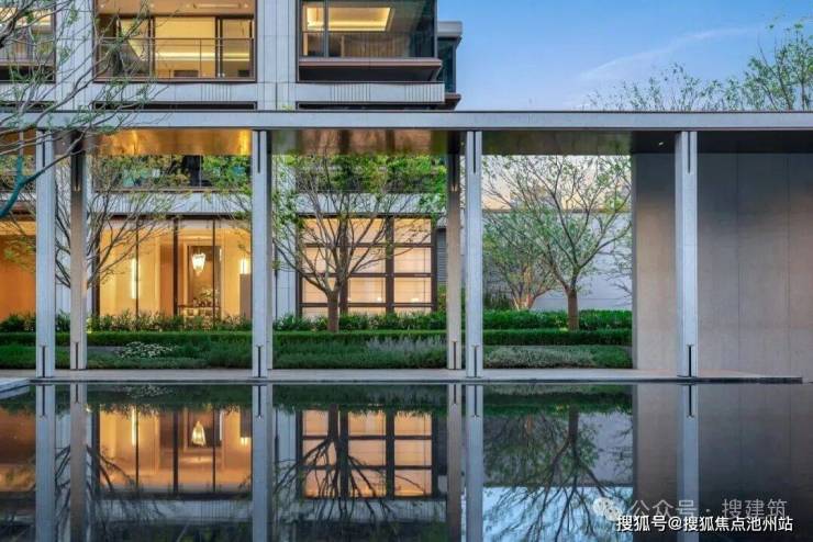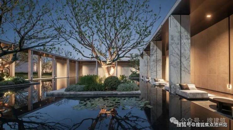 归家路径的初始篇章始于塘岸游廊的沉浸式引渡。阵列式的柱廊和景墙构建起从城市到住区的渐进式空间过渡。酒店式落客的车马院落客区和66m社区入口构成视线通廊,形成张弛有度的界面。
