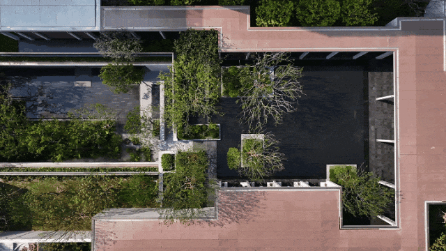 自然艺术馆灵感提取自西湖群山的层叠绿意与钱塘江潮的流动韵律,通过“三园九境”的立体布局,将自然缩微为可游可居的剧场。下沉庭院以水光粼粼的镜面池倒映天光,绿影错落间形成环形山水画卷,模糊了建筑与自然的边界。