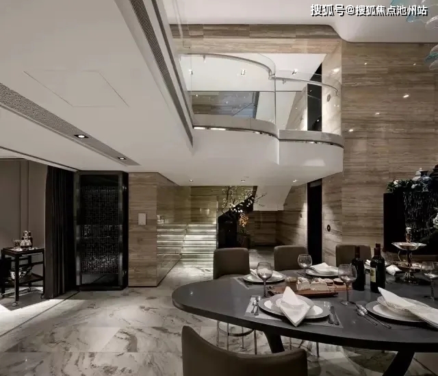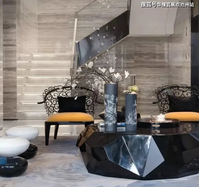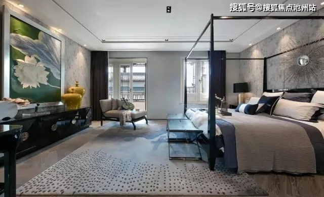 空间中每种材质皆有其特定的意涵,例如大面积的银灰洞石,取自基地旁的京杭大运河,以表达“行云流水”的概念,而客厅的江水意象地毯,呼应其中,搭配山水挂画,柔性材质与艺术装饰呈现出可亲意境。
