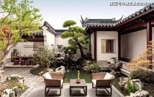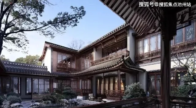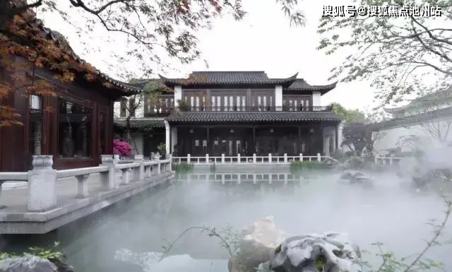 公共庭院围绕一片中心湖展开,临水三面皆是栏杆和美人靠。檐廊出挑,水阁生凉。