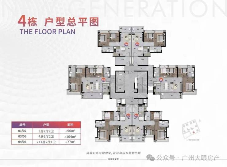 项目首推2、4、5栋,其中2栋是两梯三户,4和5栋是两梯六户,户型为建面约67-119平的二至四房。