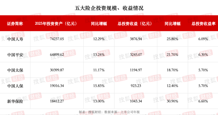 年报显示,2025 年,五大险企的投资资产总规模稳步扩张,合计投资规模约20.7万亿元,同比增加约 12.8%。