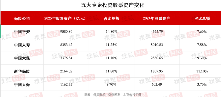 截至2025年末,五大险企股票投资金额合计达2.46万亿元,较上年末猛增超过1万亿元,增幅高达71.7%。