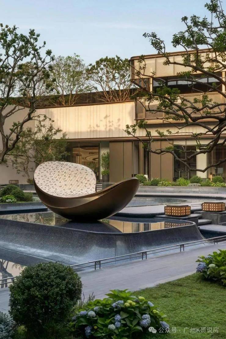 由广东非遗剪纸大师饶宝莲亲手打造的“勇立潮头舟”跃然眼前。整个作品采用铜凿剪纸和金漆木雕结合的工艺,镂空雕刻了羊城八景的纹样。在庭院水景的映衬下,犹如龙舟竞渡,生生不息,寄寓着天曜业主抢占先机,敢为人先的进取精神。