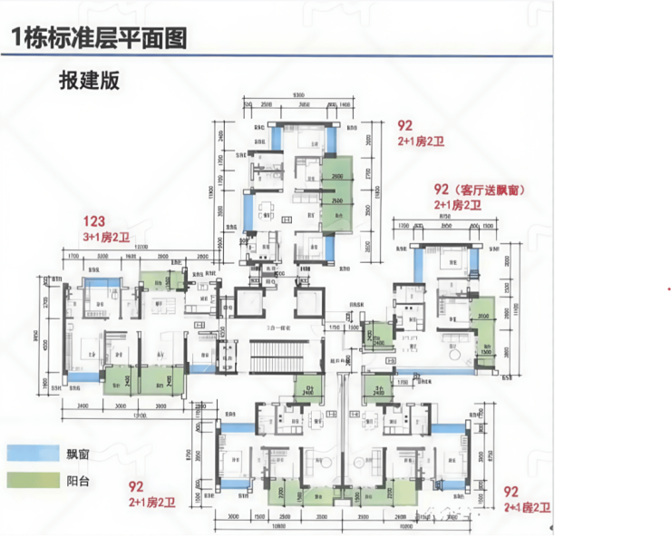 项目主推92-141㎡三至五房,全南向设计,主打高使用率,最高可以达到118%,关键词:110%+使用率、2梯3-5户、全南向。