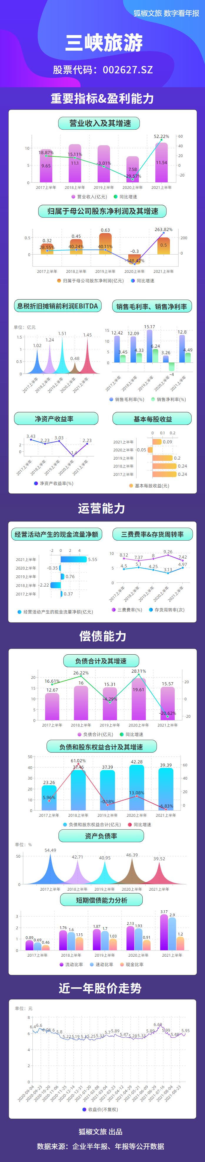 8月22日,湖北三峡旅游集团股份有限公司(股票代码:002627)发布2021年半年度报告。上半年,三峡旅游营业收入11.54亿元,同比增长52.22%;实现归属于上市公司股东的净利润0.49亿元,同比上涨263.82%;基本每股收益0.09元,同比上涨263.69%;总资产为39.39亿元,比上年度末减少-11.10%。