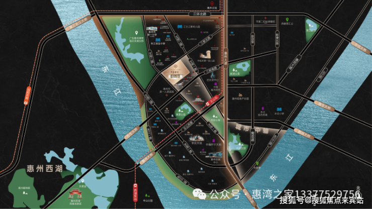 项目于东江之畔,近揽华贸天地、佳兆业广场等大型商业综合体,俯瞰高尔夫球场一碧万顷自然景观,繁华与生态在此完美交融。