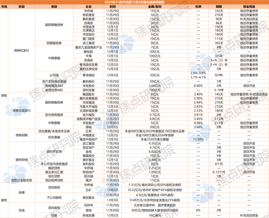 与之前几周相比,本周房企在股权融资市场动作明显减少,主要有首创置业退市业务重组,出让旗下首置物业100%股权及北京同创金龙置业25%股权;华侨城廊坊项目、五矿苏州项目均挂牌出让部分股权计划引入合作伙伴;花样年为还债将北京密云国祥府、国祥雲著两项目转让给旭辉;绿地则是将创驿大厦60%股权30亿卖给了第二三大股东,并约定2年内以实际投入金额增加每年8%收益之和回购;新城发展计划供股近16亿港元获大股东全额认购。