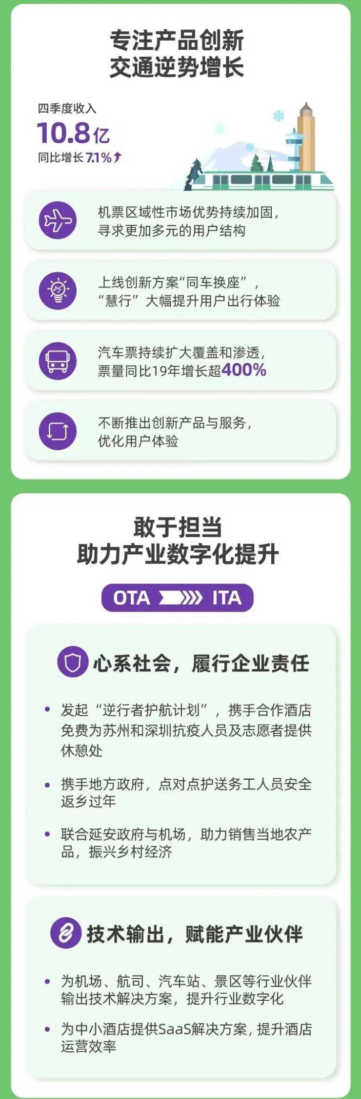 2021年,同程旅行交通业务收入为44.6亿元,同比增长28.4%。同程旅行交通业务深入众多国内三线及以下城市,其中,2021年第四季度汽车票销量较2019年同期增长超400%。