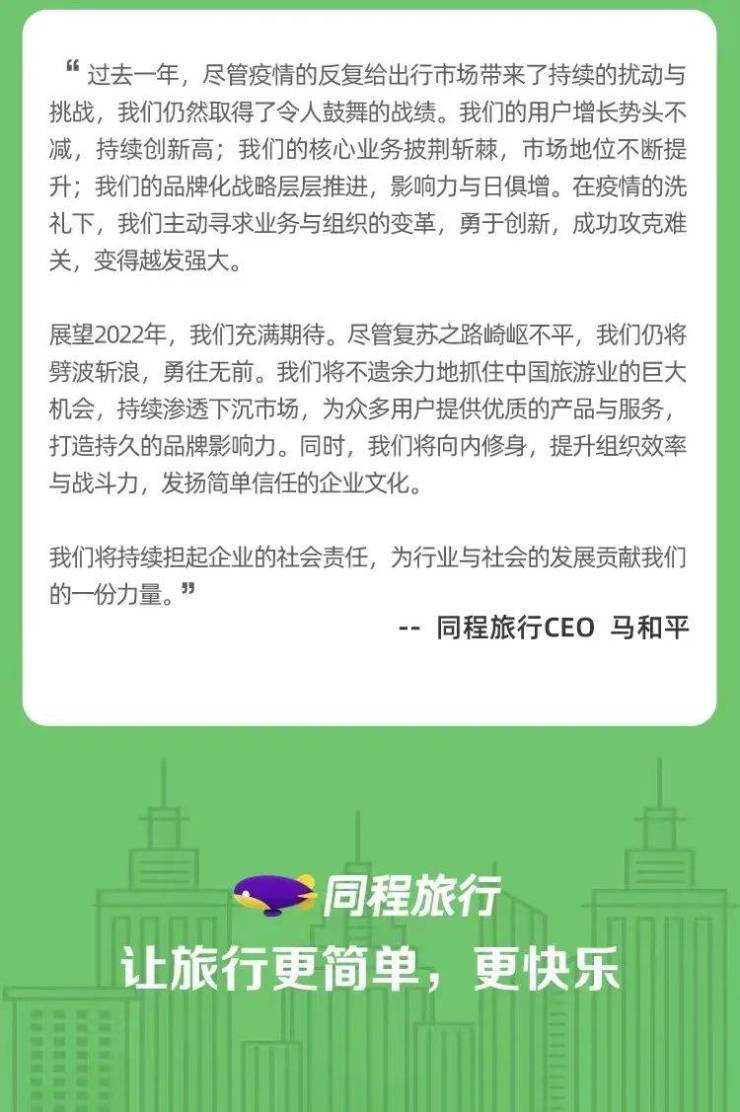 科技让服务下沉,创新助文旅复苏。同程旅行CEO马和平表示,我们将不遗余力抓住中国旅游业的巨大机会,持续渗透下沉市场,为众多用户提供优质的产品与服务,打造持久的品牌影响力。未来,公司将持续承担企业的社会责任,为行业与社会的发展贡献一份力量。