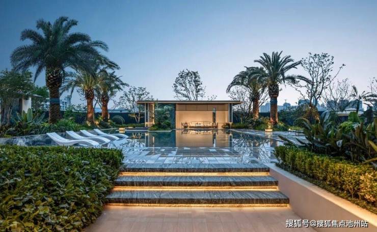 池畔栽种6棵武林壹号同款的加拿利海枣树阵,每棵直径都超50公分。风吹叶动,摇曳着浓烈奢华感。