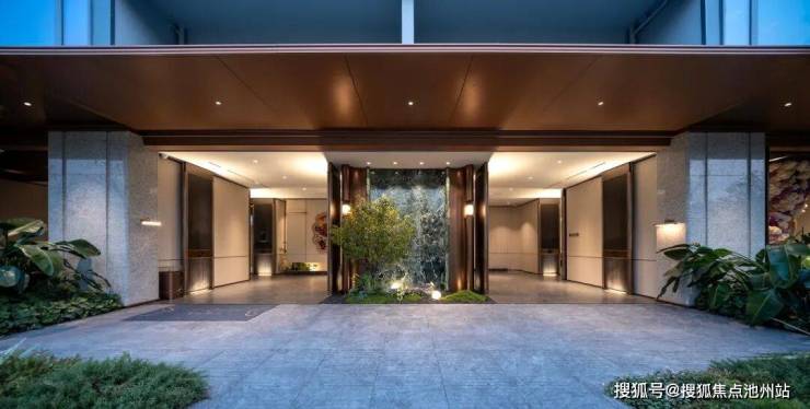 你甚至数不清,它究竟藏了多少重水的章法:大门前有“聚水生财”的雕塑喷泉,主入口有数米高的石墙瀑布。穿过风雨连廊,漂浮着约430㎡镜面水院。