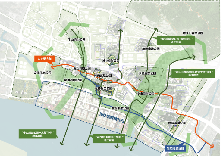 绿色出行:交通网络组织优化,细化海丝城通江廊道,构建慢行空间系统、通山达海漫游路径;构造海绵城市和韧性城市;努力建设打造绿色低碳超低能耗建筑项目。