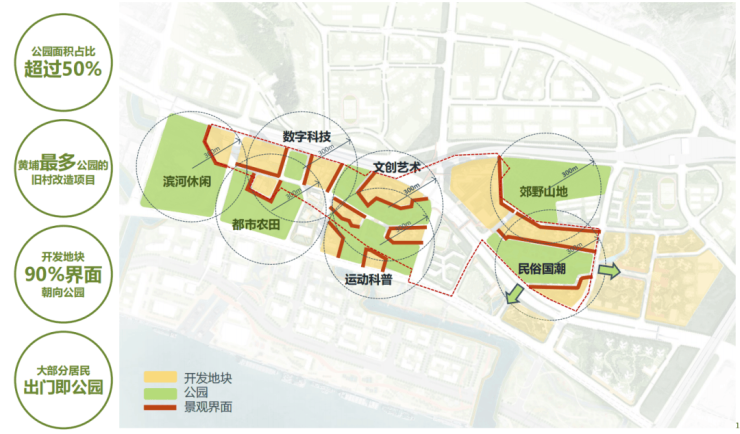 结合本土文化内涵塑造9个特色主题公园:海丝科技公园、都市农田公园、岭南艺境公园、沙浦国学公园、城市塑影公园、缤纷童趣公园、龙舟生态公园、远洋文化公园、桥畔运动公园。