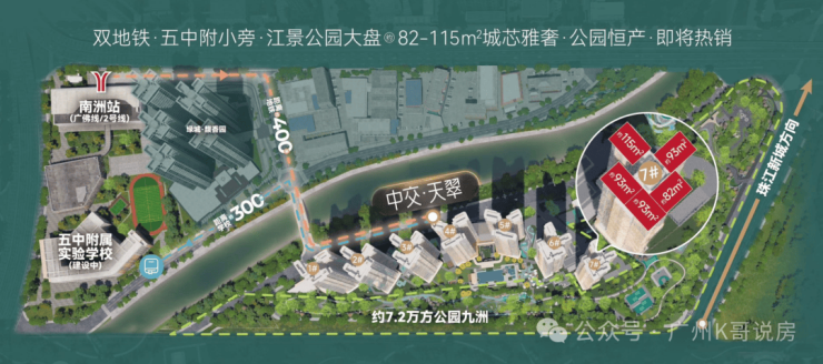 南面和东面九洲双园,搭配小区内七大运动主题大花园,拥有约7.2万㎡景观配套,在海珠很少见,也只有中海大境、琶洲南等豪宅盘,有这个条件。