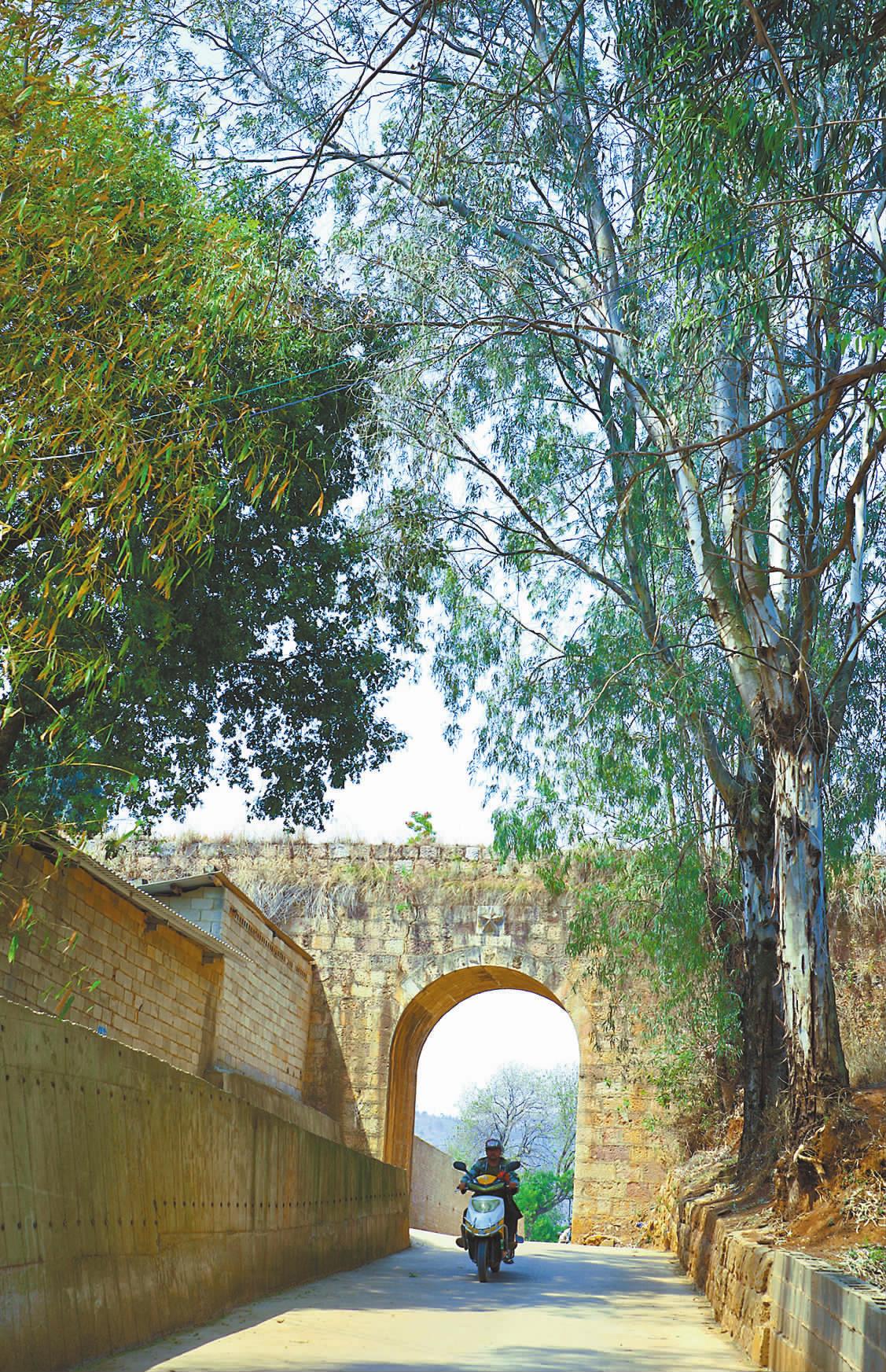 临近中午,在附近打工的村民骑着摩托车、自行车,从古老的石拱门穿过,陆续返家吃午饭,一派安居乐业的景象。