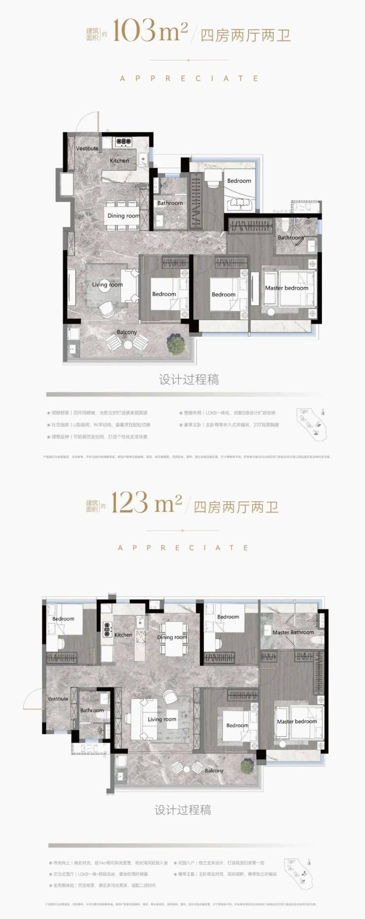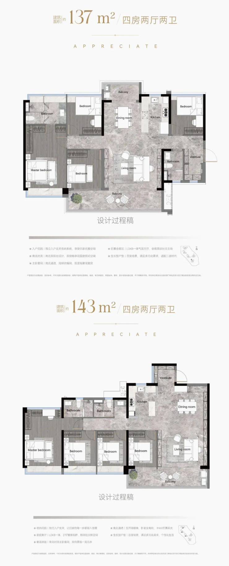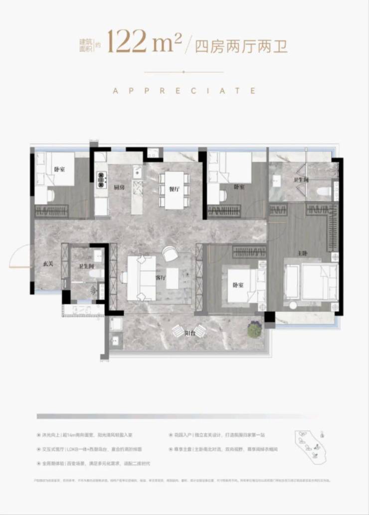 户型亮点:超 17 米南向面宽,四开间朝南,双主套设计,使用率高达 126%;